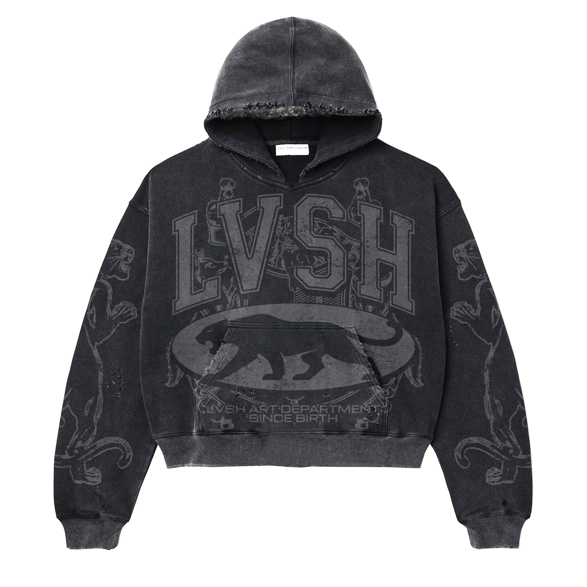 Details: Distressing on Hood and Pocket edges. Vintage Washed